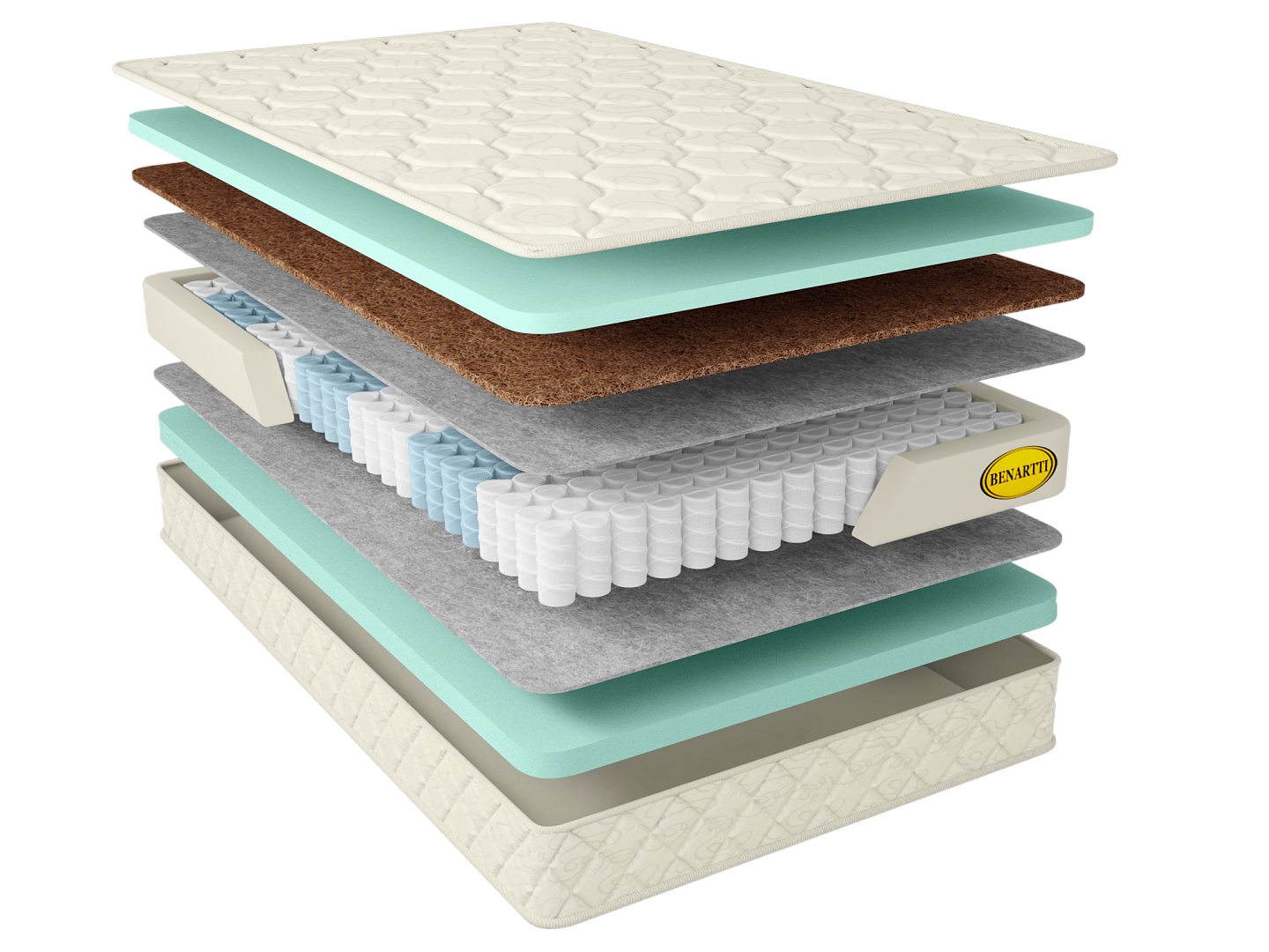 Для дополнительной защиты пружинного блока добавлен изоляционный слой из войлока, разделяющий и защищающий наполнители матраса и пружинный блок. С одной стороны матраса расположен слой кокосовой койры толщиной 1 см, придающий дополнительную жесткость и долговечность матрасу и поверх слой искусственного латекса высотой 3 см, обладающий анатомическим эффектом и износостойкими свойствами. С другой стороны матраса расположен слой искусственного латекса высотой 4 см, обладающий анатомическим эффектом и износостойкими свойствами. Чехол матраса, выполнен из хлопкового жаккарда, простеганного на экологически чистом материале Hollcon. Ткань обработана специальной антибактериальной пропиткой SANITIZED (Швеция). Пропитка обеспечивает полное уничтожение плесневых грибков, не дает развиваться микроорганизмам, пылевым клещам и микробам.