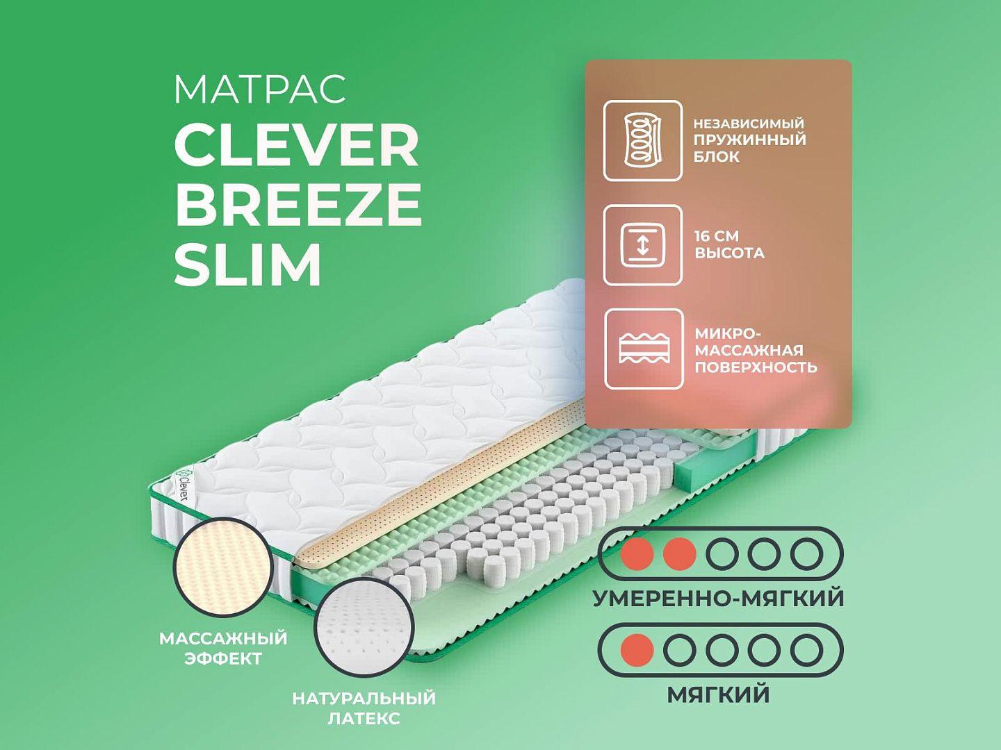 Фабрика Clever получила заслуженную репутацию, благодаря применению новых технологий и безупречному соблюдению стандартов качества. Clever Breeze Slim размером 90х195 — образец продукта с лучшими характеристиками и доступной ценой, матрас создан из дышащих тканей, с эффектом вентиляции.