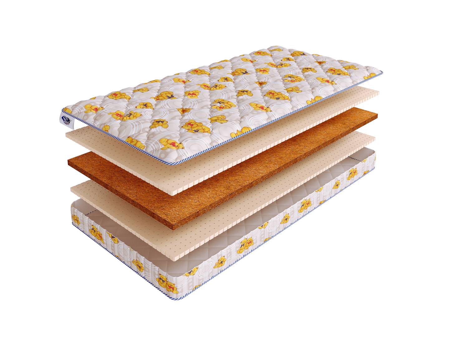 Основу матраса составляет блок кокосовой койры толщиной 3 см, обеспечивающей ортопедичность спального места. Слои натурального латекса, расположенные с двух сторон матраса, смягчают его поверхность и делают сон малыша более комфортным.